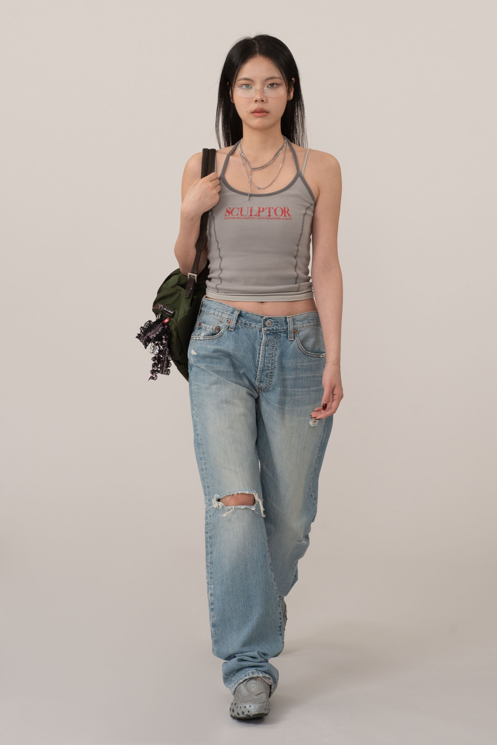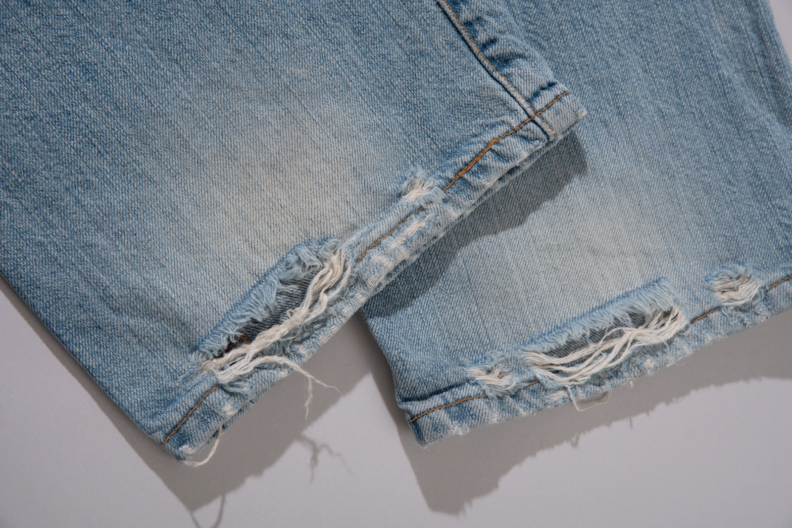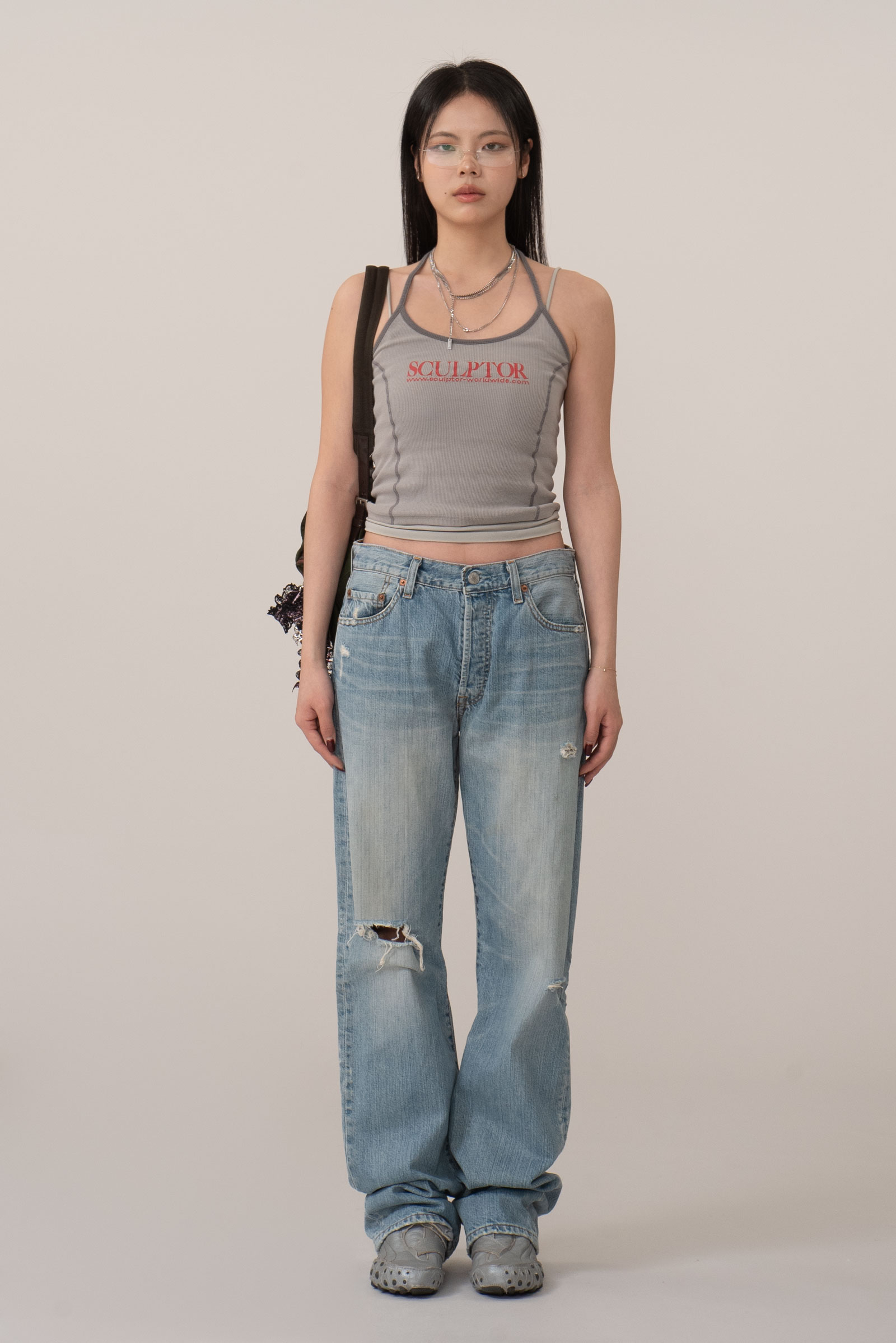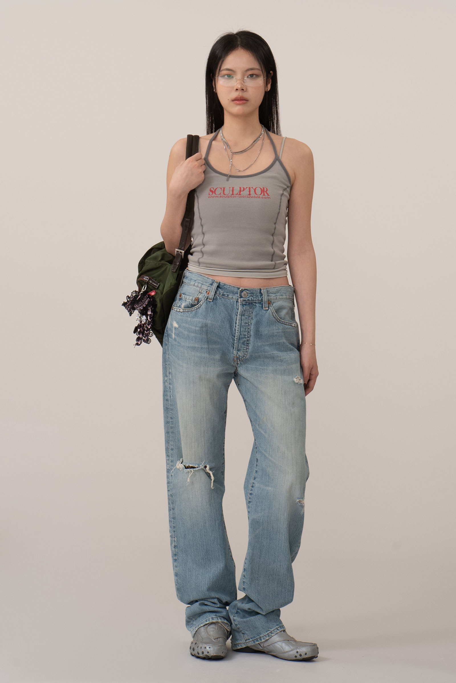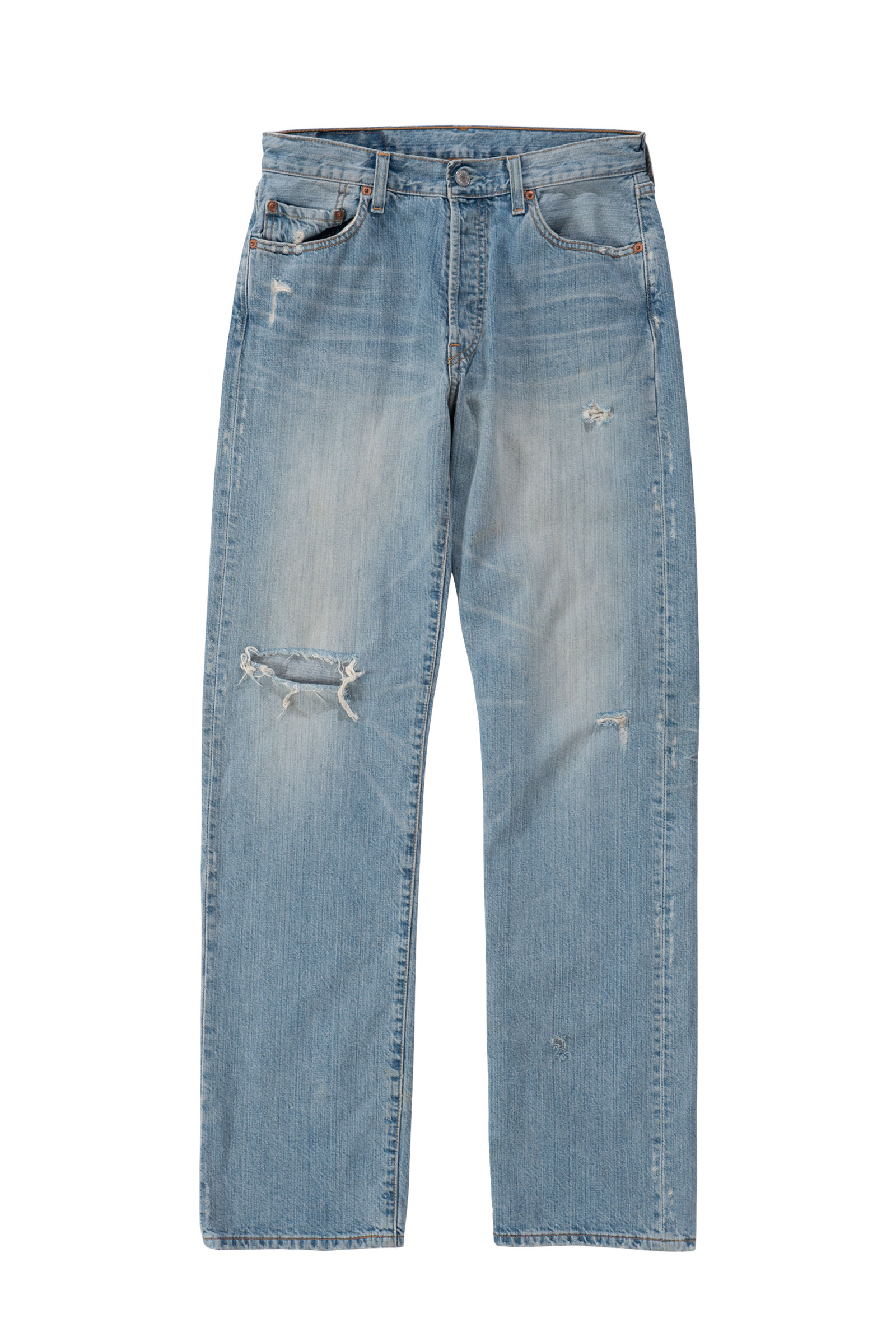 버튼 플라이 디테일이 주는 올드한 감도는 그대로 가져가면서 무릎과 곳곳의 자연스러운 디스트로이드 포인트가 룩에 힘을 실어줘 단품만으로도 충분히 포인트 되는 피스랍니다.
