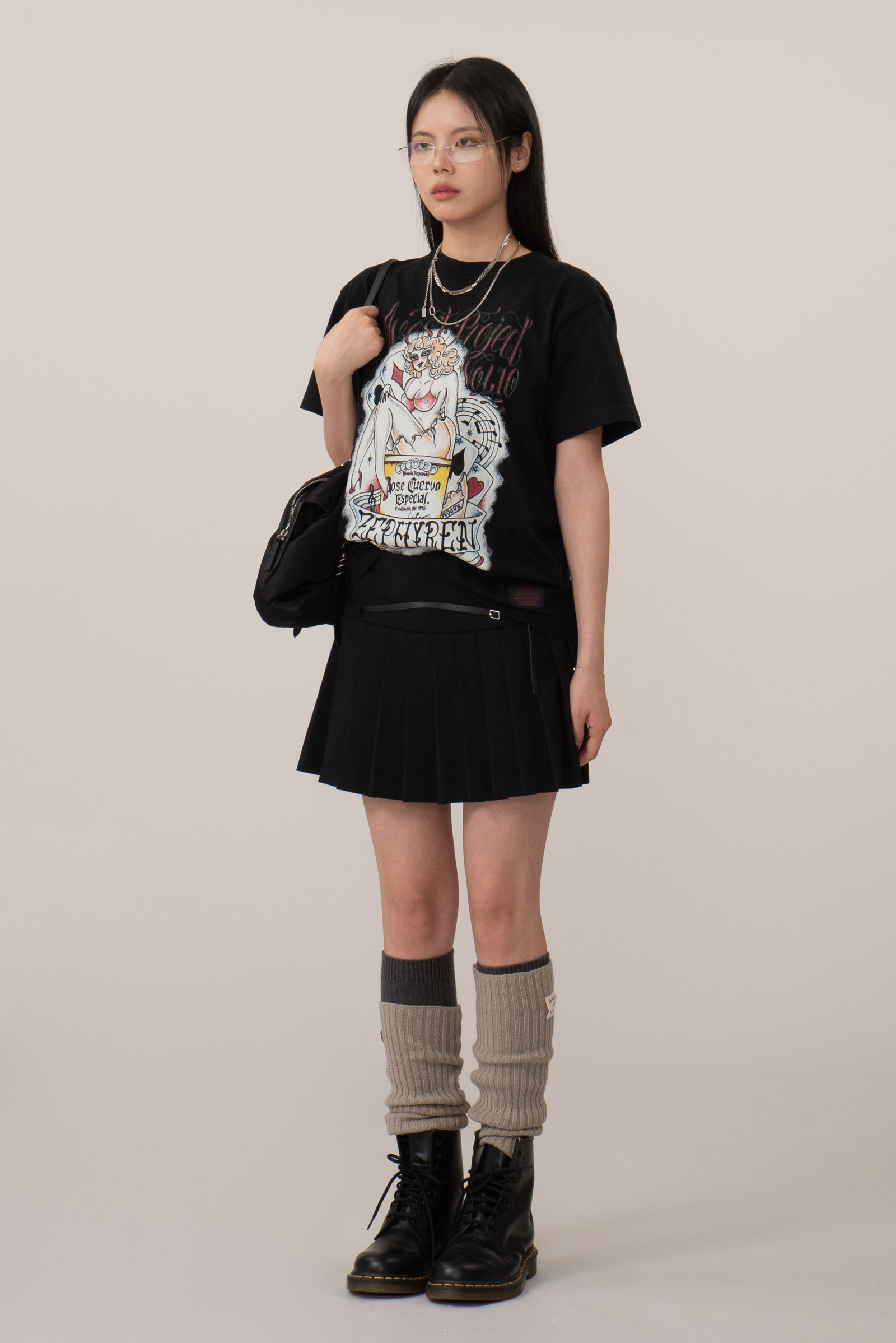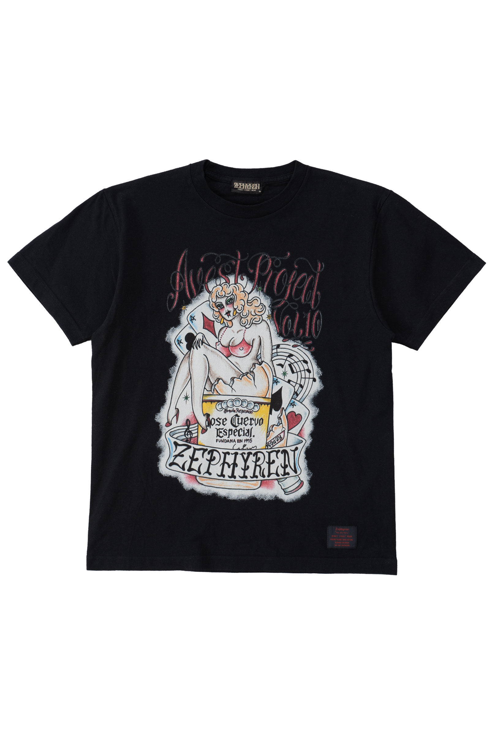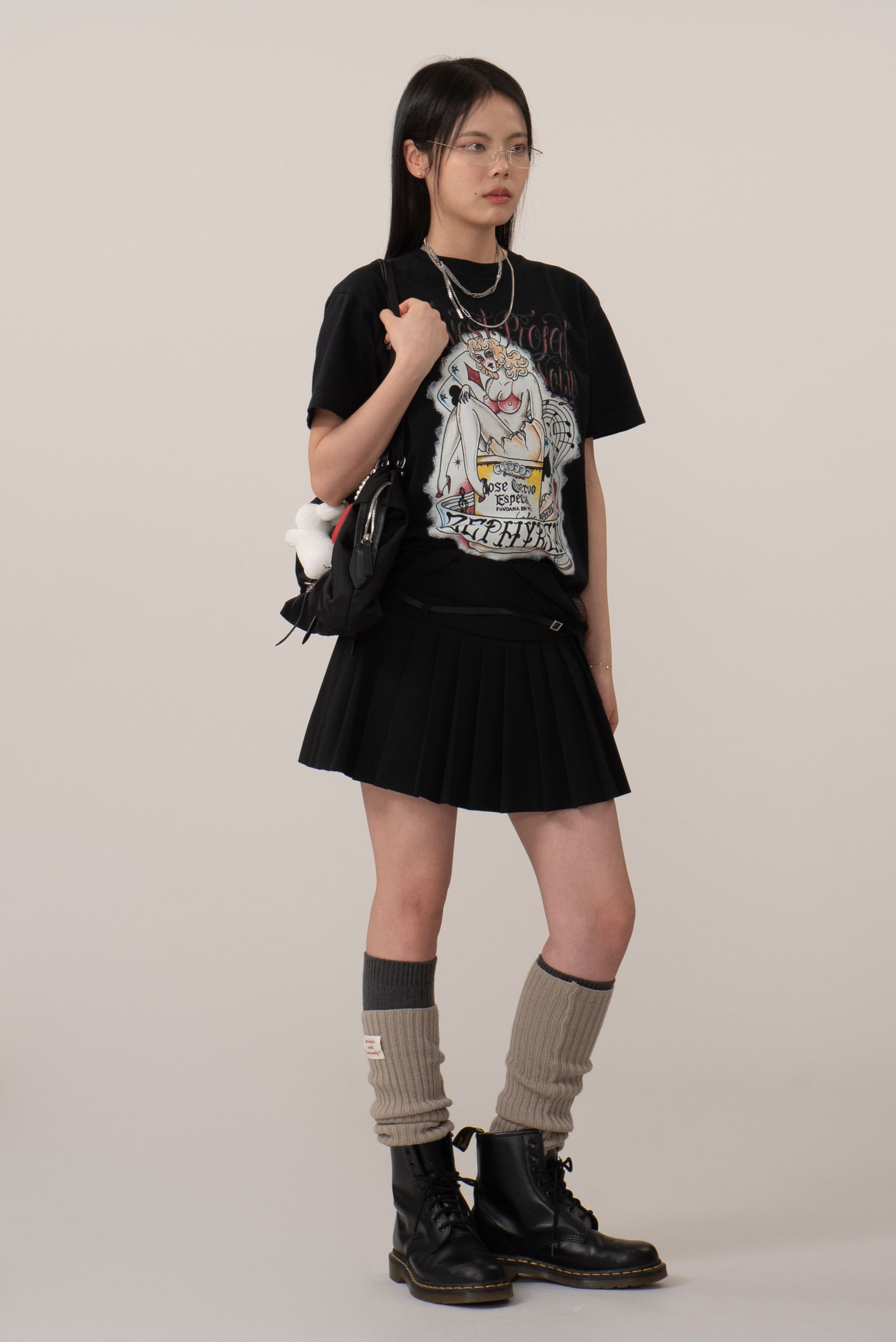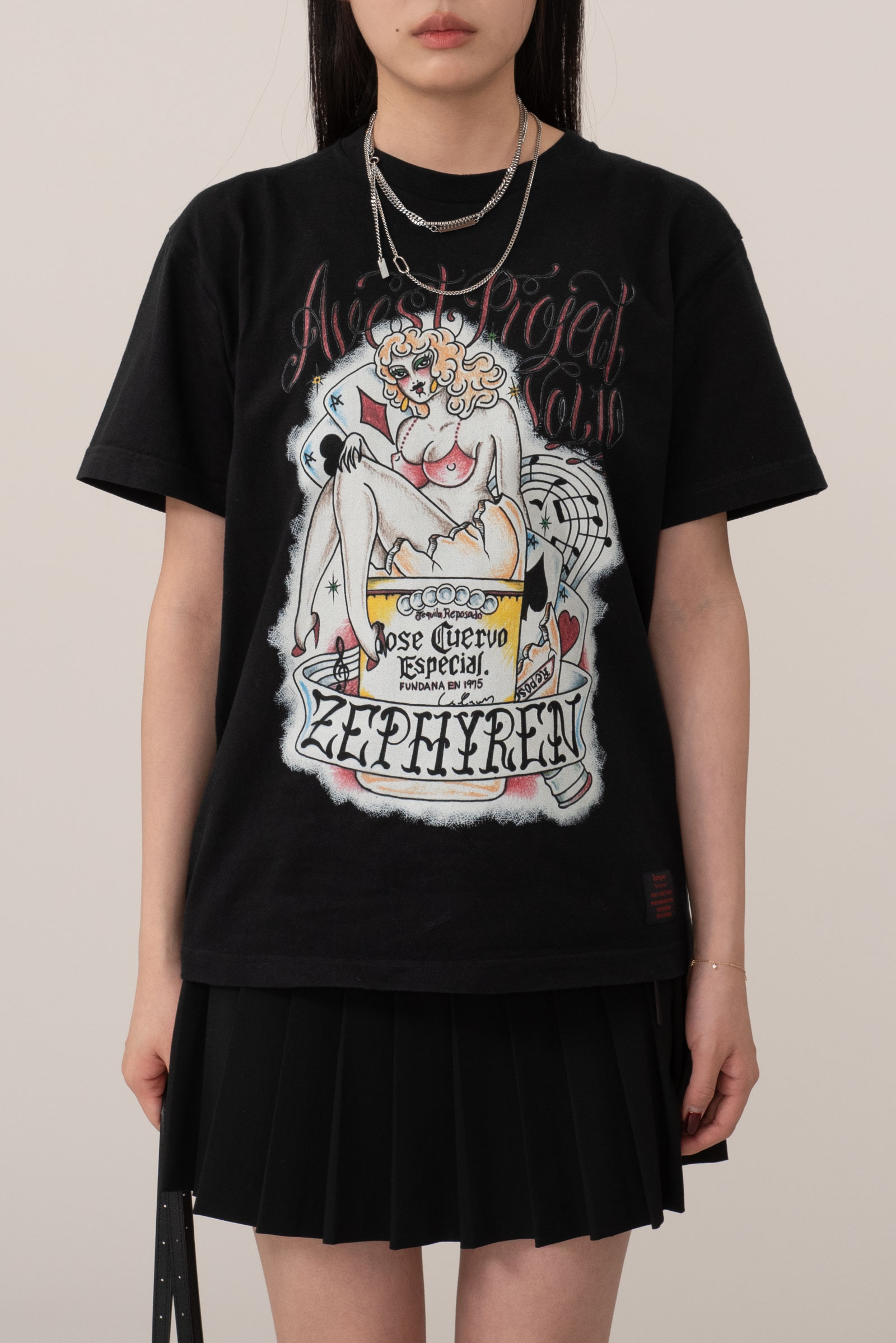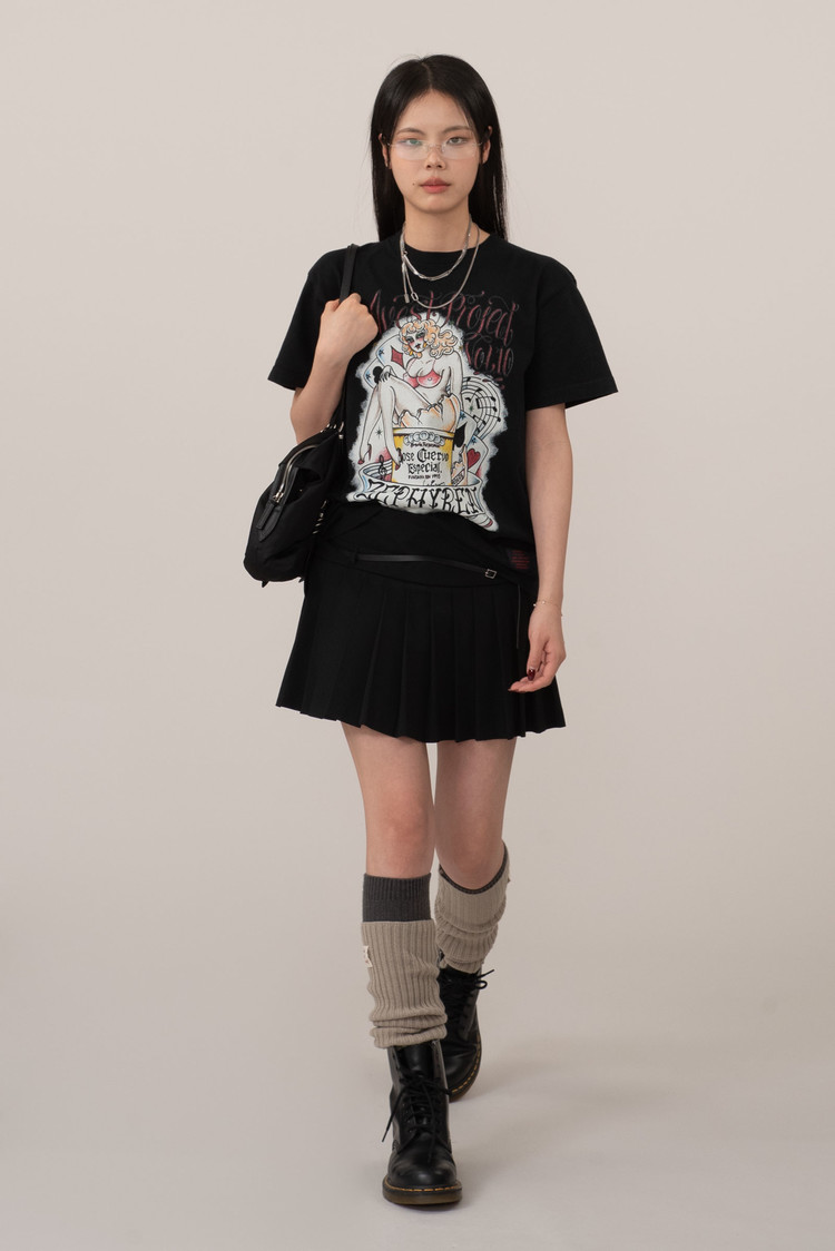 핀업걸 보다는 드랙퀸으로 보이는 커다란 캐릭터의 개성, 후면은 다양한 로고가 촘촘히 쌓인 라인업, 하단의 굵은 폰트와 날짜 프린트 역시 한장만으로 충분히 포인트 되는 피스랍니다.