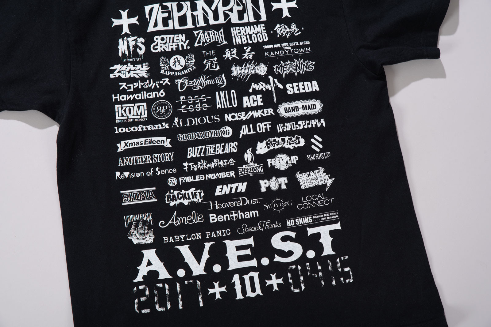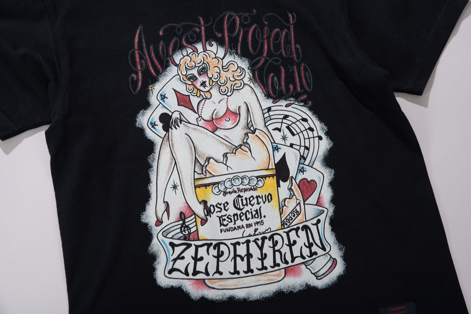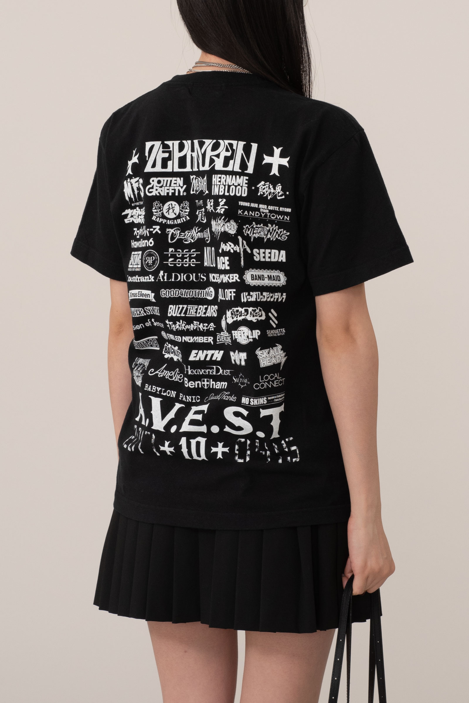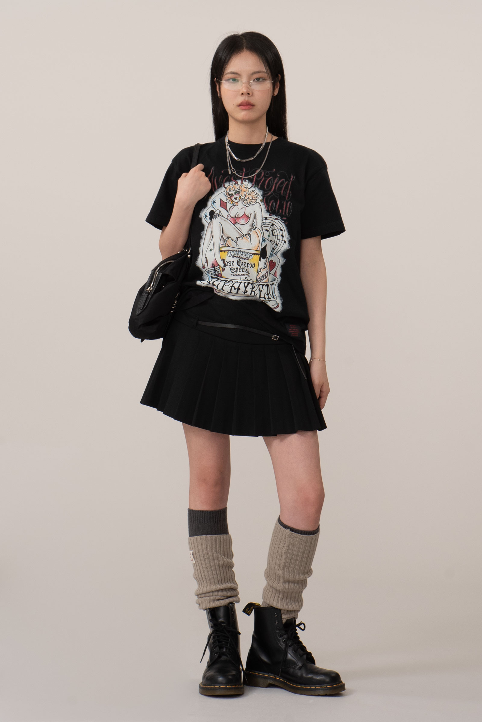 핀업걸 보다는 드랙퀸으로 보이는 커다란 캐릭터의 개성, 후면은 다양한 로고가 촘촘히 쌓인 라인업, 하단의 굵은 폰트와 날짜 프린트 역시 한장만으로 충분히 포인트 되는 피스랍니다.