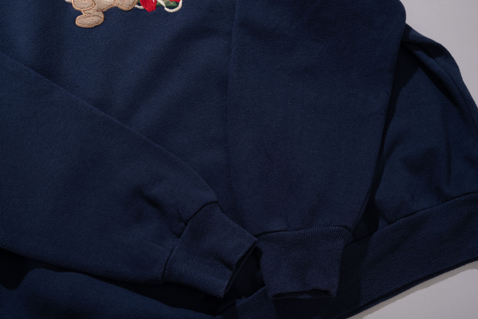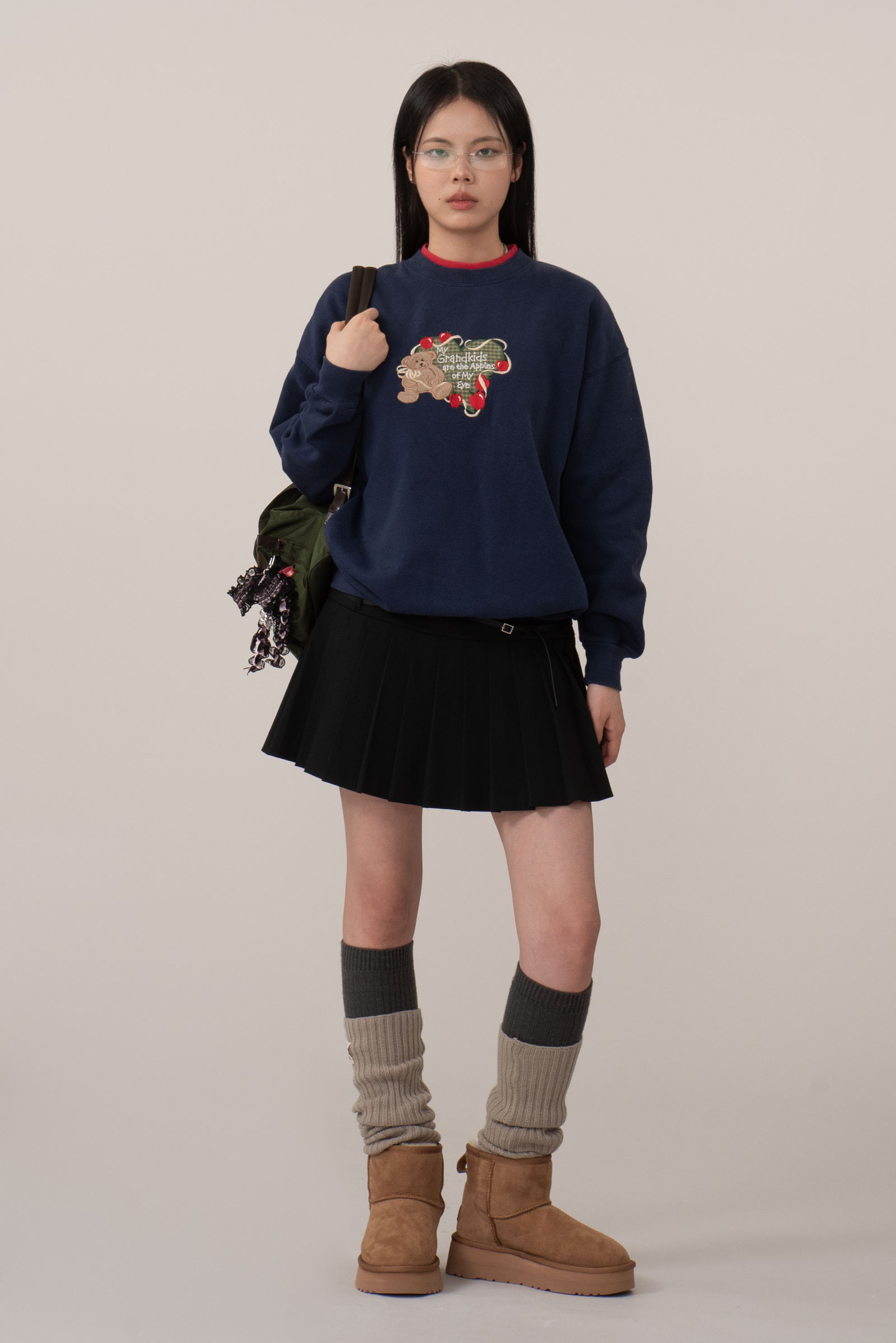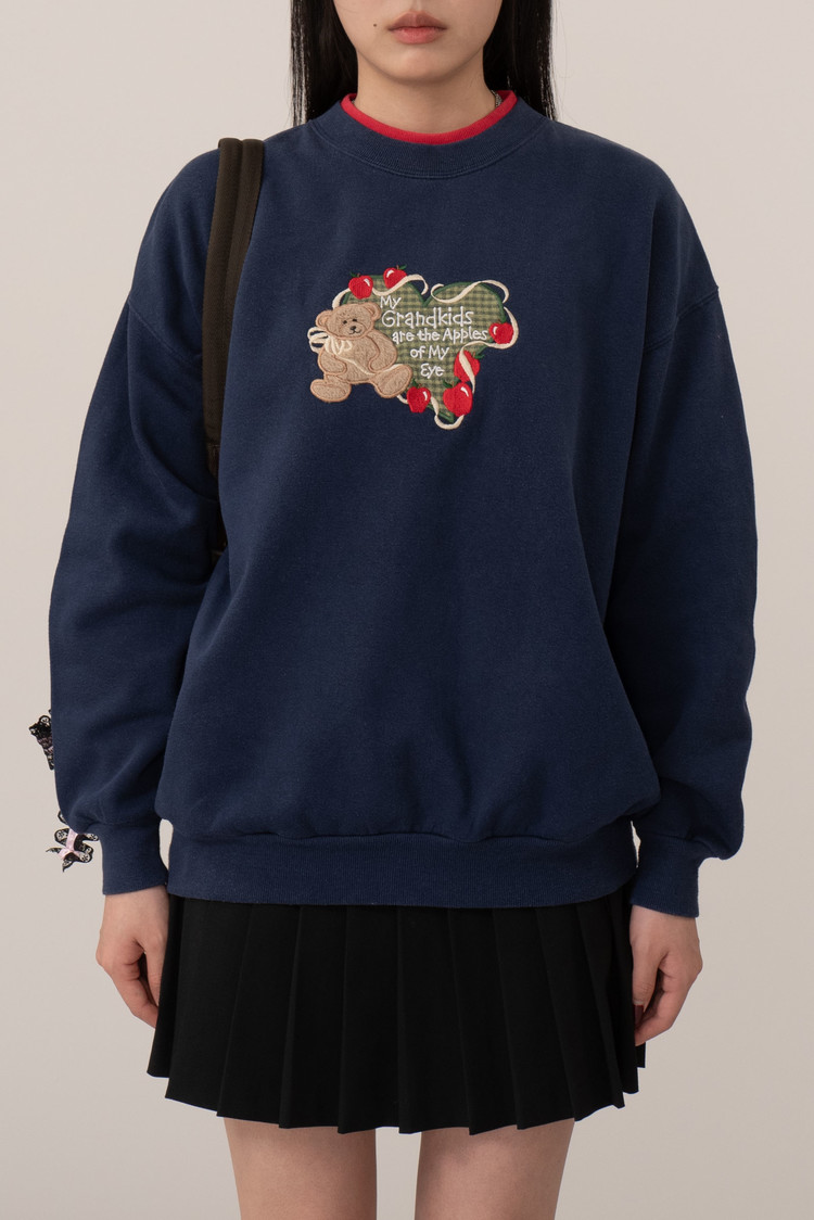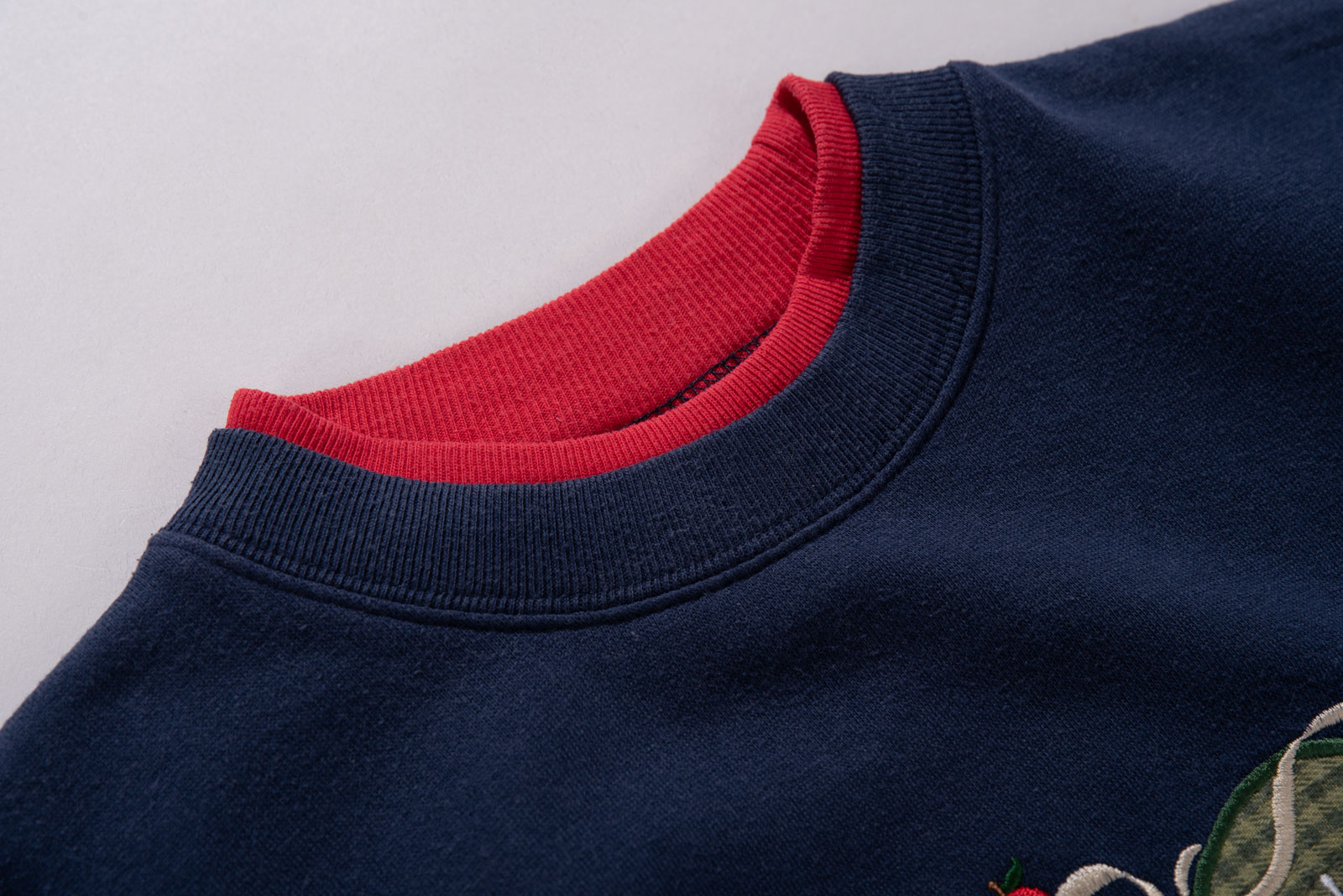 어디에나 착용하기 좋은 네이비 컬러에 배색 넥 라인과 전면 캐릭터, 귀여운 자수가 돋보이는 피스인데요.
