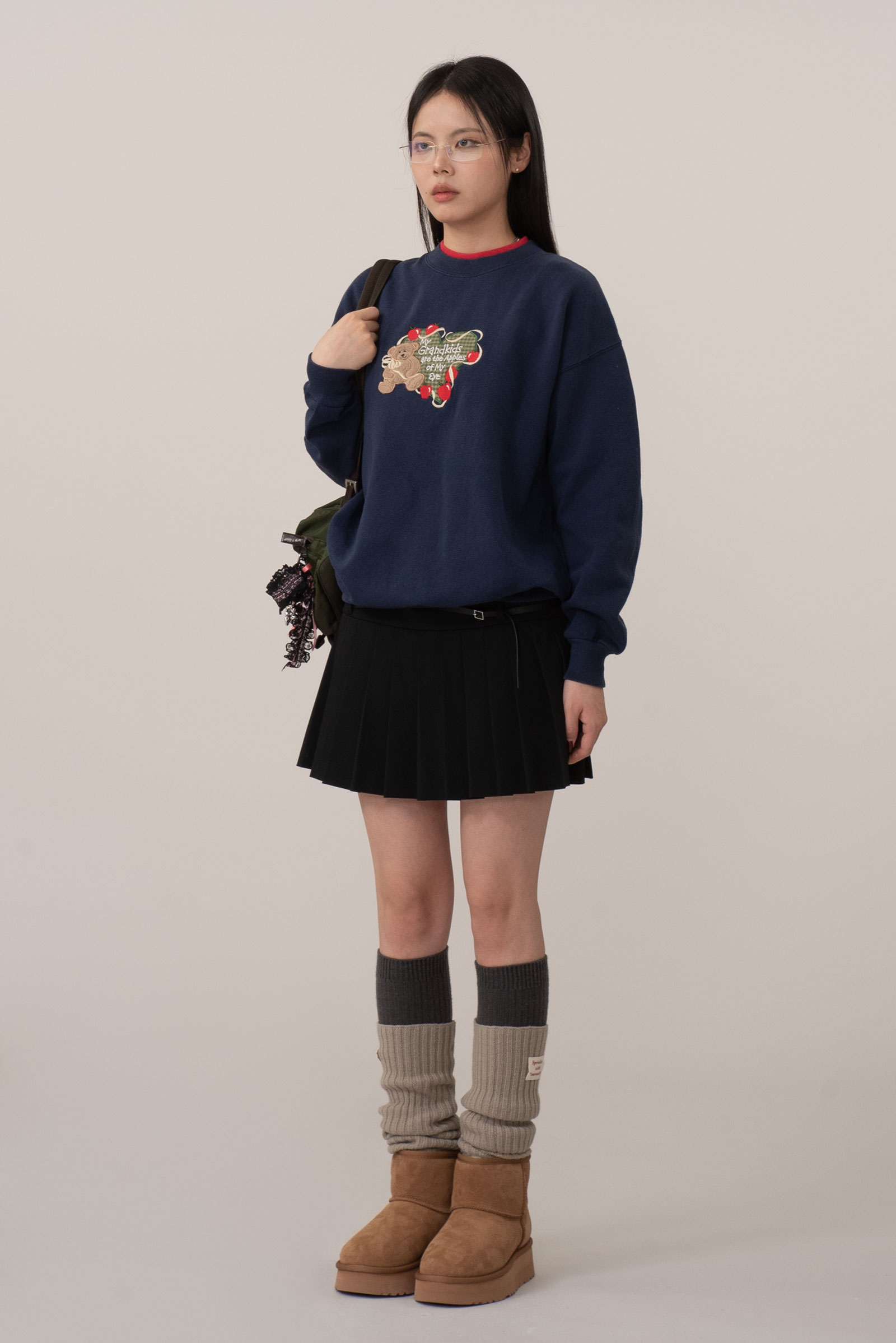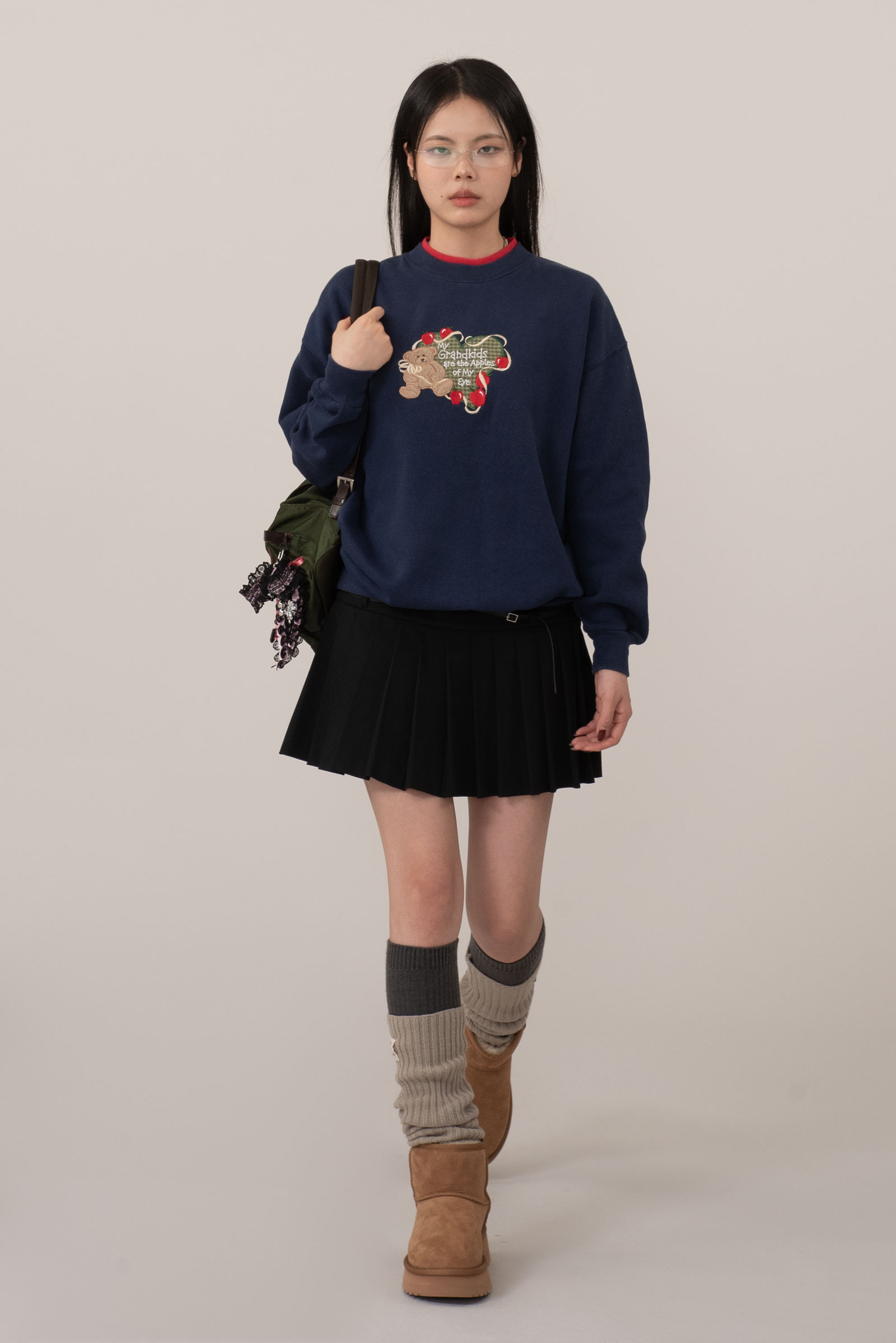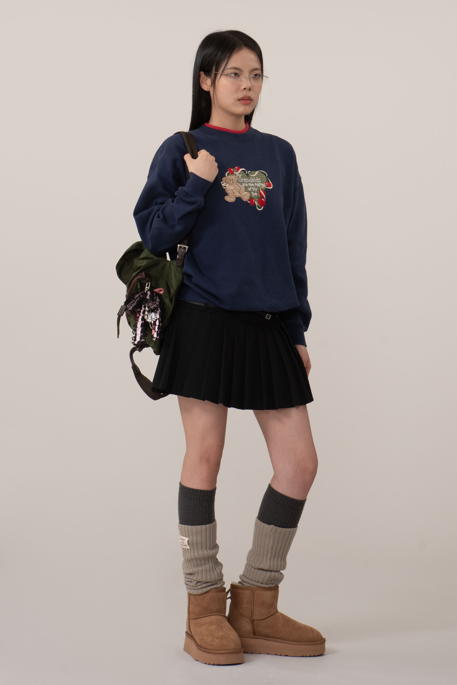 어디에나 착용하기 좋은 네이비 컬러에 배색 넥 라인과 전면 캐릭터, 귀여운 자수가 돋보이는 피스인데요.